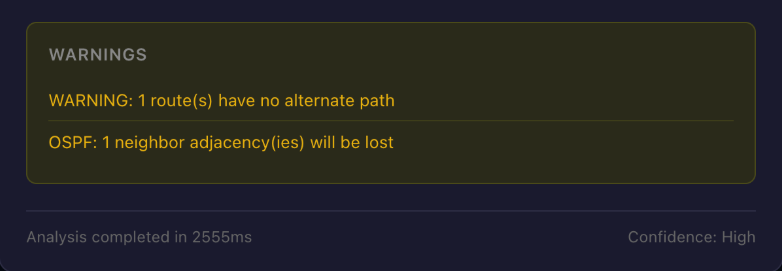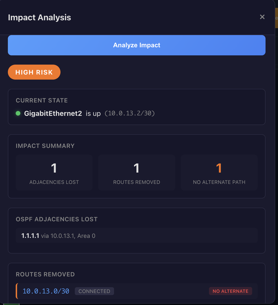 When I ran impact analysis, the system returned HIGH risk. One route, a /30 connected network, had no alternate path. The OSPF adjacency would drop, and there was no redundant link for that subnet. The response included the exact warning: "1 route(s) have no alternate path." That's the kind of dependency that can be missed manually.