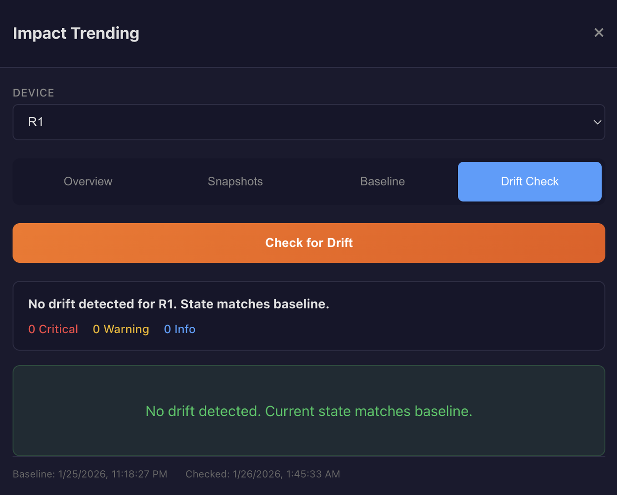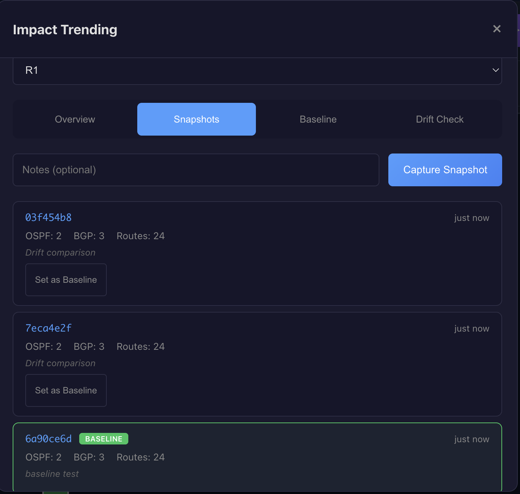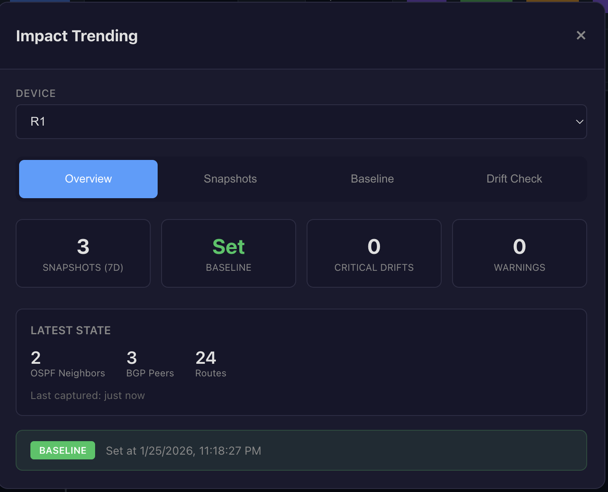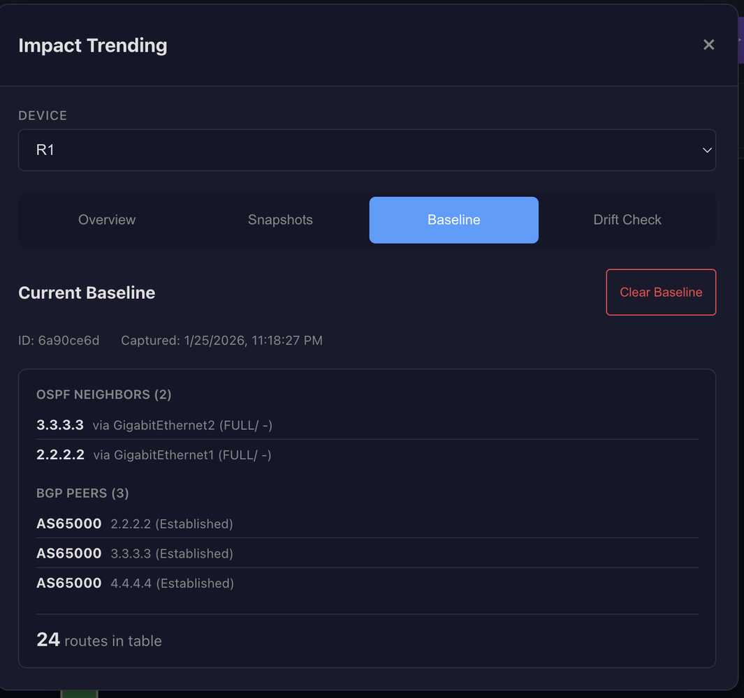 A baseline represents "known good" state. When you've verified a device is healthy, you save that snapshot as the baseline. Future drift detection compares current state against this reference.