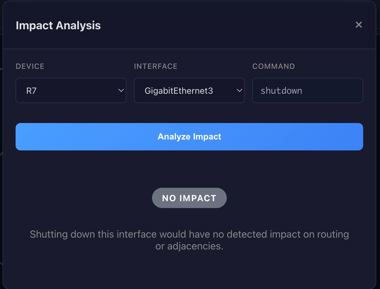 Before any change executes, the impact analyzer builds a dependency map. It parses live device state, including OSPF neighbor tables, BGP summaries, and routing tables, then identifies exactly what will break if you proceed. The analysis is protocol-aware. For a proposed interface shutdown, the system identifies OSPF adjacencies that will drop, BGP peers that become unreachable through subnet matching, routes that depend on that path, and whether alternate routes exist through different interfaces.